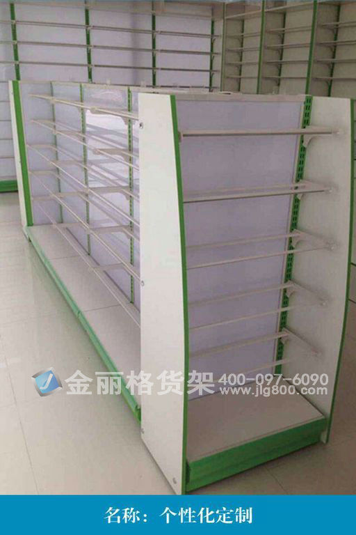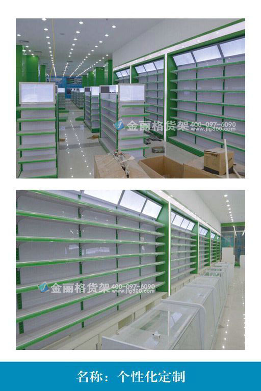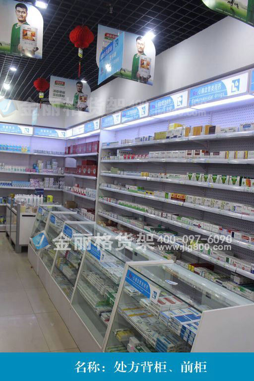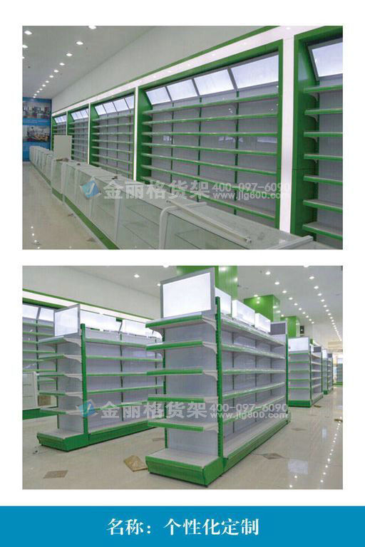 品 名:玻璃框层板药店货架,孕婴店货架,边为果绿色,专业药房货架,药店货架价格