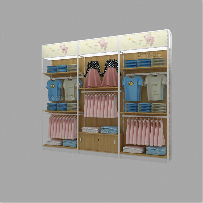 新款童装货架 木纹背板童装货架,钢木组合材质