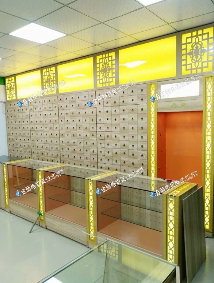 金丽格参茸背柜和中药前柜规格可以定做,材质为柜体夹板,可做木纹和烤漆。