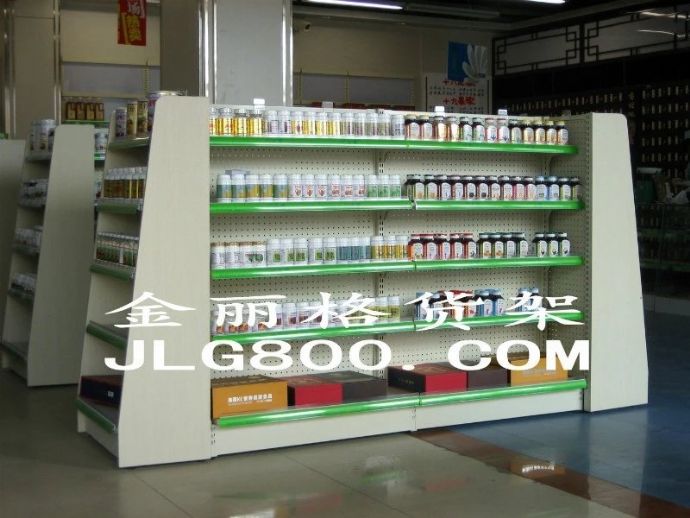 材质说明:背板、层板、底座、药店灯箱为冷轧钢板,标价条为塑料,层板可以上下调节高度,根据商品大小;